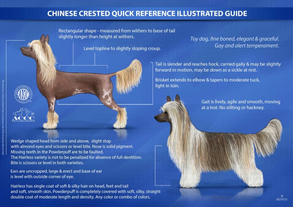 Neck – Neck is lean and clean, slightly arched from the withers to the base of the skull and carried high. Topline – Level to slightly sloping croup. Body – Brisket extends to the elbow. Breastbone is not prominent. Ribs are well developed. The depth of the chest tapers to a moderate tuck-up at the flanks. Light in loin. Tail – Tail is slender and tapers to a curve. It is long enough to reach the hock. When dog is in motion, the tail is carried gaily and may be carried slightly forward over the back. At rest the tail is down with a slight curve upward at the end resembling a sickle. In the Hairless variety, two-thirds of the end of the tail is covered by long, flowing feathering referred to as a plume. The Powderpuff variety’s tail is completely covered with hair.
